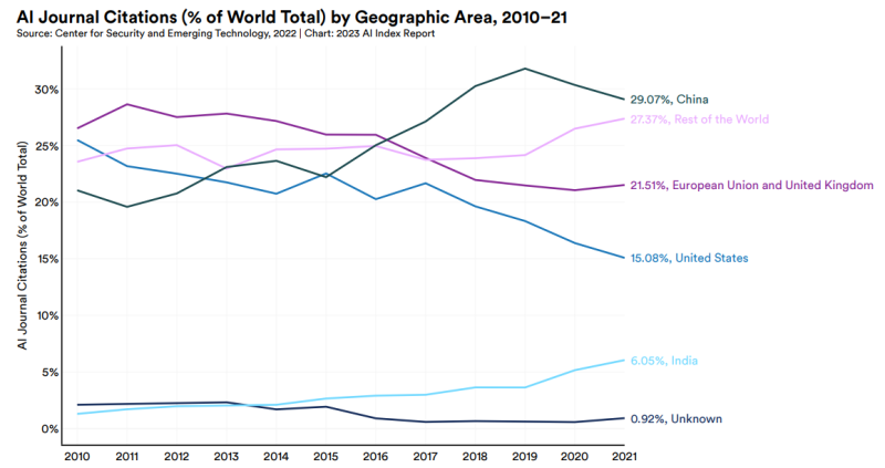 스탠퍼드 대학원 조사에 따르면 ‘21년 전 세계 AI 특허 출원의 절반 이상을 출원했으며, 중국 연구자들이 AI 저널 논문과 AI 인용의 약 3분의 1을 생산했다는 사실이 확인됐습니다.