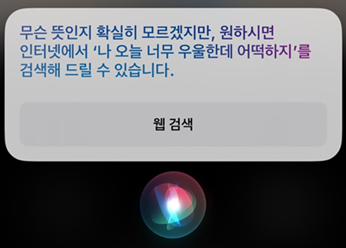 우선 현재의 시리에게 "나 오늘 너무 우울한데 어떡하지?"라고 물어본다면, 아래와 같은 제한적인 답변을 내놓습니다.