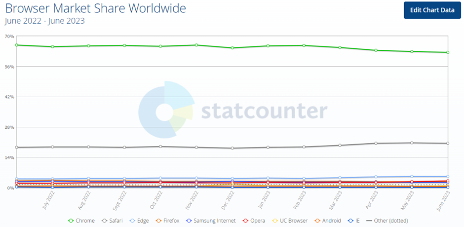 이러한 접근 방식은 앞서 ChatGPT와 결합한 빙에서도 적용된 전략으로, Edge브라우저의 점유율을 높이기 위해 Edge에서만 구동될 수 있도록 제한하기도 했습니다. 이렇게 함으로써 3~4%로 유지되던 점유율을 5.27%까지 올릴 수 있었습니다.