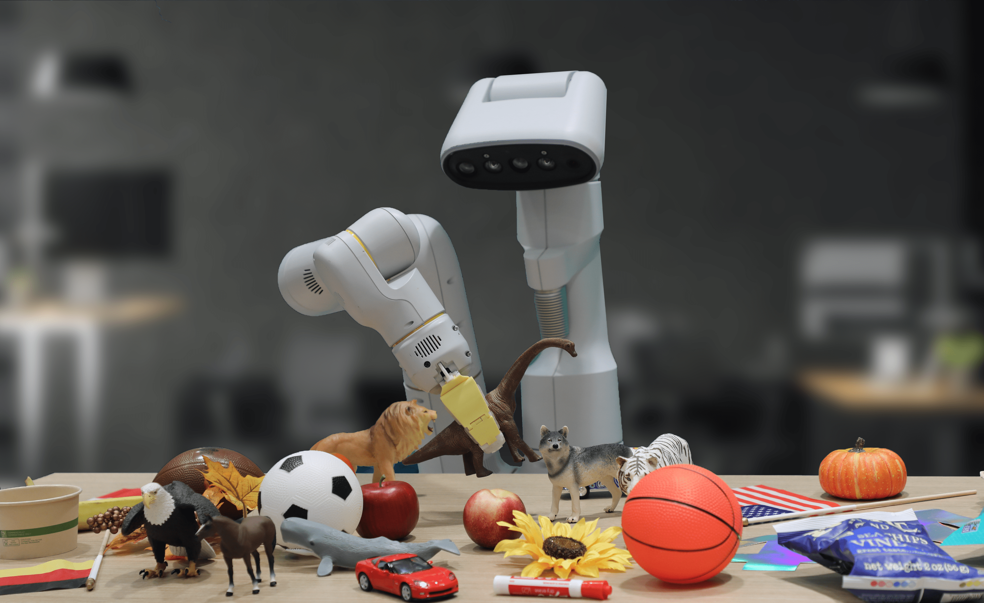 구글 산하의 연구소 딥마인드는 대형 비전 언어 모델(VLM)을 통해 로봇 제어를 하는 연구를 하고 있는데, 최근에 발표한 결과가 흥미롭습니다. RT-2(Robotic Transformer2)라 불리는 로봇에게 다양한 사물과 동물들이 섞여있는 테이블에서 "멸종된 동물을 집어줘"라고 요청하니 여러 선택지 중 정확하게 공룡을 집어낸 것이죠.