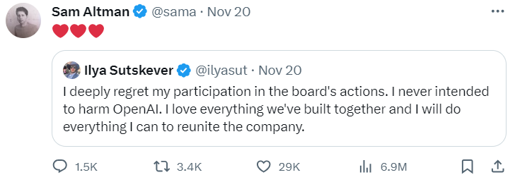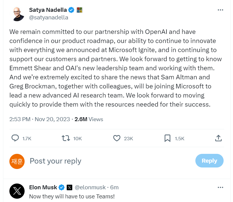사티아 나델라(공식발표) : 샘 올트먼과 그렉은 마이크로소프트에서 인류를 위한 AI 개발을 지속할 것입니다. 샘과 함께 MS입사를 희망하는 OpenAI 연구원은 언제든 문을 두드려 주시기 바랍니다.