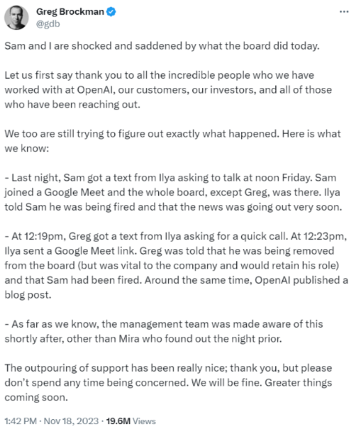 이사회(공식 발표) : 샘과 그렉은 해임되었으며, 다음 CEO가 정해지기 전까지 무라티(CTO)가 임시 CEO를 맡게 됩니다.