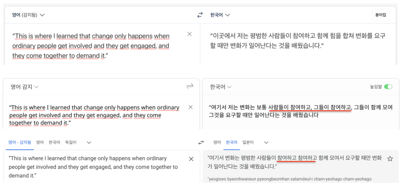 (순서는 딥엘, 파파고, 구글 순이며 번역의 대상은 버락 오바마 전 미국 대통령의 취임 연설문에서 발췌)
